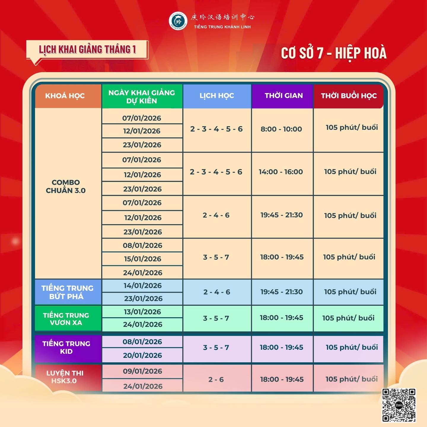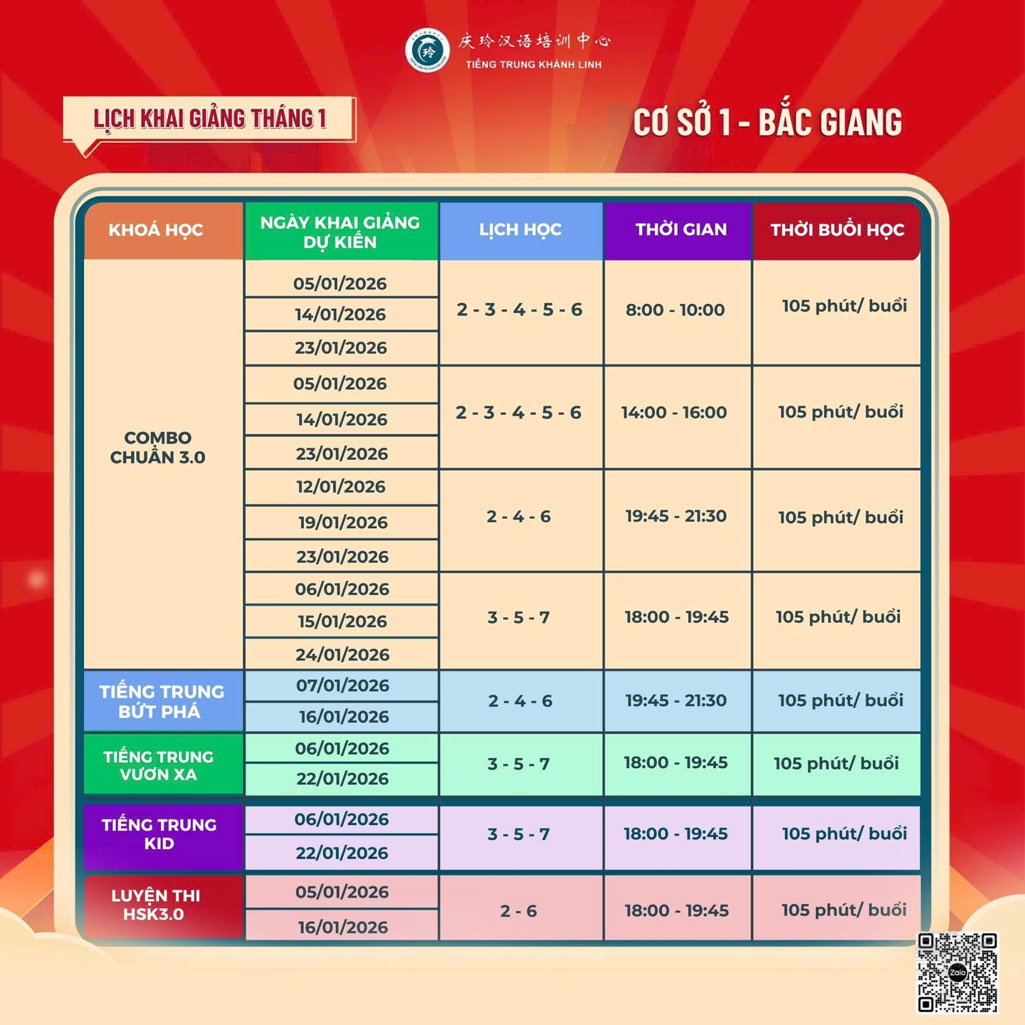 Dưới đây là lịch khai giảng các lớp tiếng Trung tháng 01/2026 của Tiếng Trung Khánh Linh Lộ trình 3.0 từ cơ bản đến nâng cao và các chương trình Ưu đãi học phí cực hấp dẫn. Các bạn tham khảo và chọn khóa học phù hợp cho mình nhé!